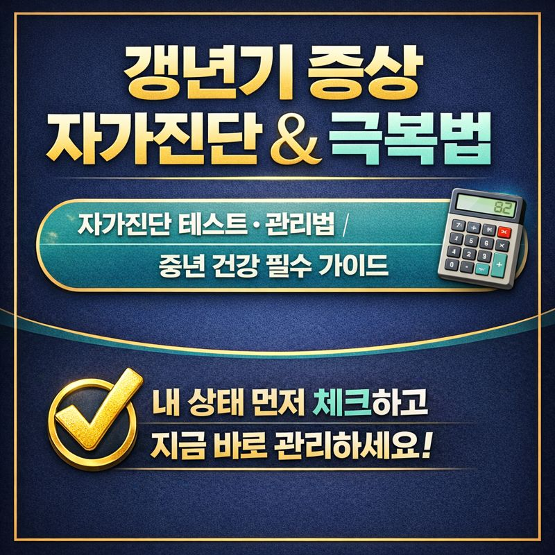 갱년기는 피해야 할 문제가 아니라 내 몸의 변화를 이해하고 돌보는 시기입니다. 오늘은 자가진단 점수부터 확인하고, 한 가지 생활습관부터 천천히 바꿔보세요.