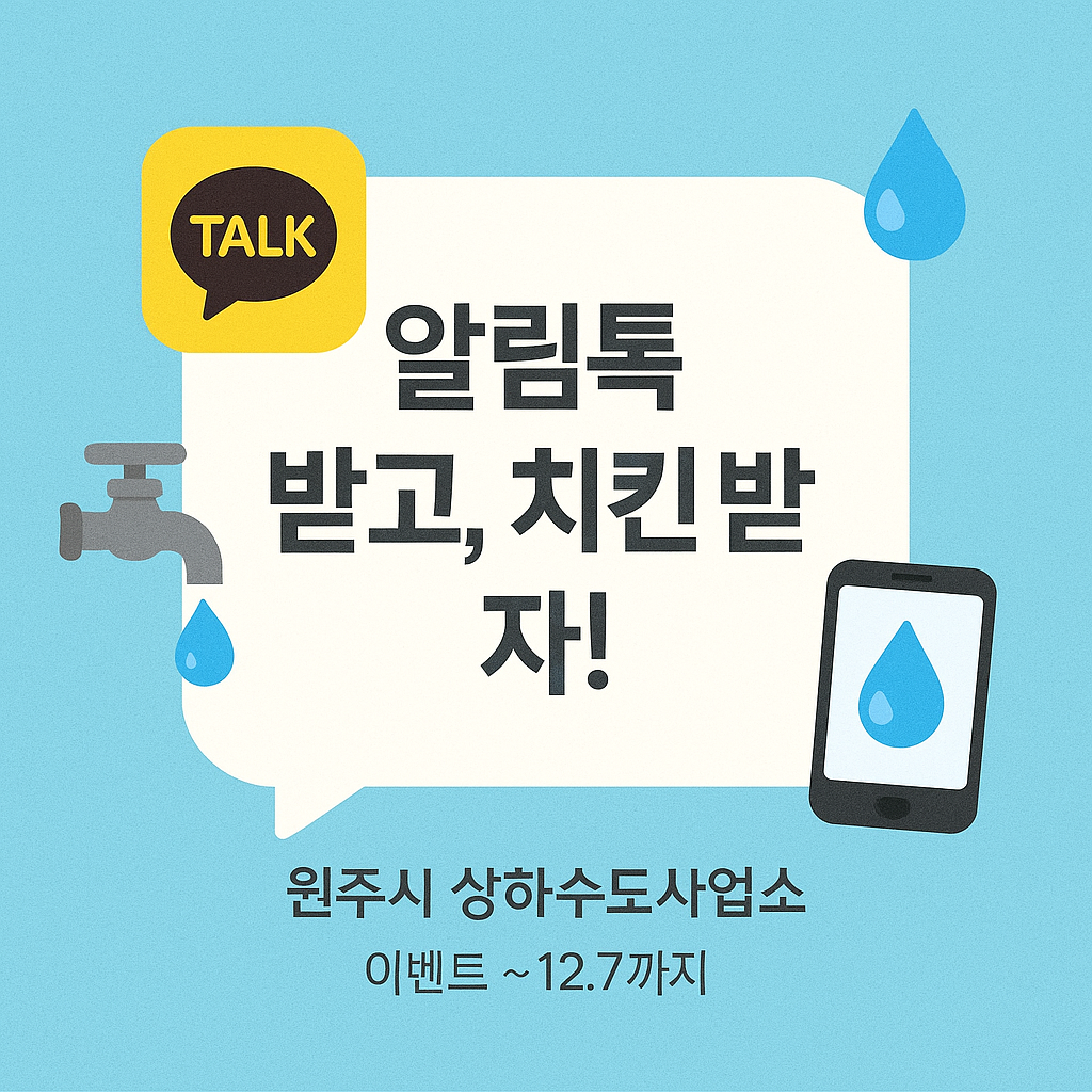 원주시에서 제공하는 '수도요금 알림톡 서비스'에 가입하면, 고지서를 카카오톡으로 바로 받아볼 수 있을 뿐 아니라 치킨·커피 쿠폰까지 받을 수 있는 이벤트까지!