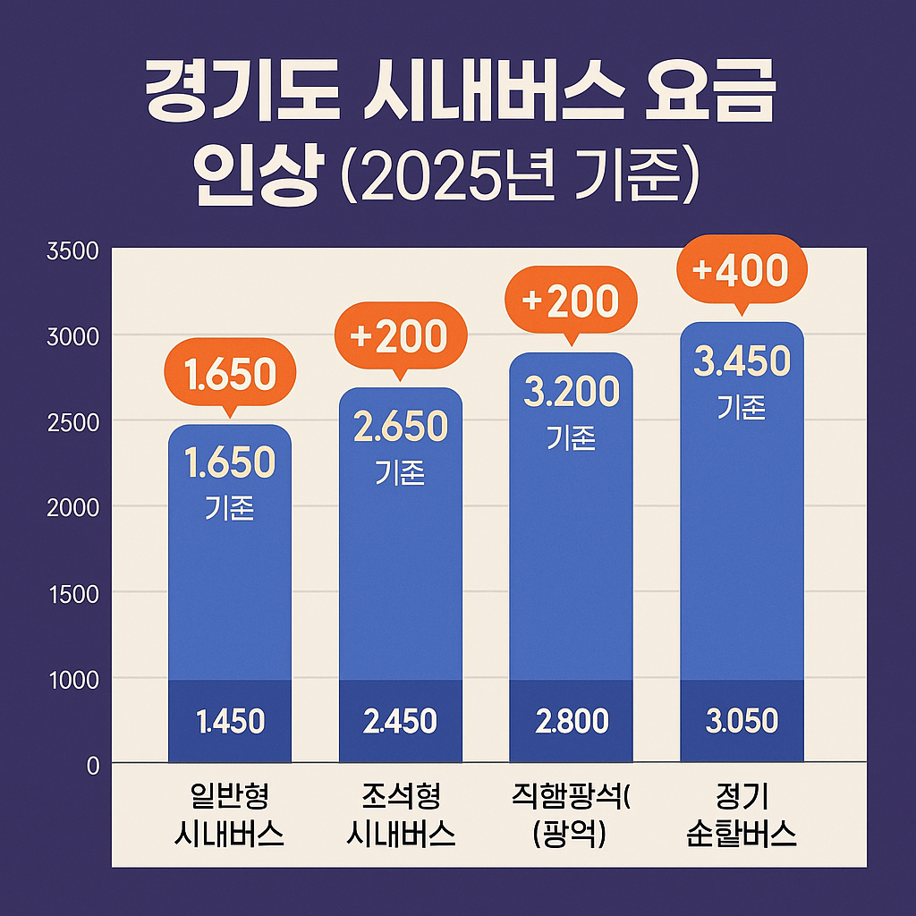 | 좌석형 시내버스 | 2,450원 | 2,650원 | +200원 | 2,500 → 2,700원 |