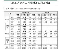 | 버스 유형 | 기존 요금(교통카드) | 인상 후 요금(교통카드) | 인상폭 | 현금 요금 |